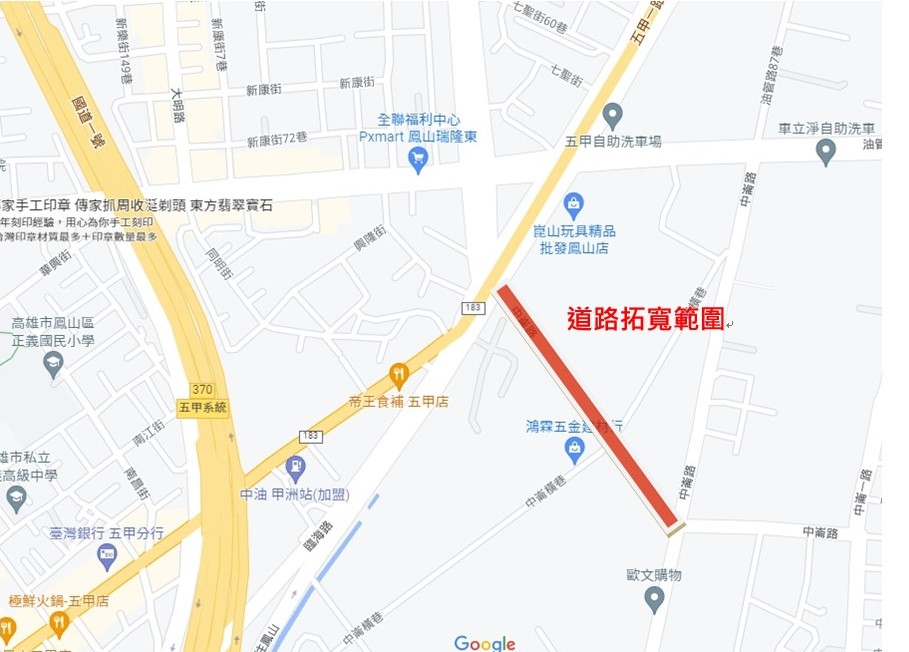 工務局表示,鳳山區中崙路位屬都市計畫農業區內,原有道路寬度約4.5公尺~6公尺,為中崙社區與五甲路間重要聯絡道路,因道路寬度不利雙向會車,且路旁為開放式水利溝渠,老弱婦孺騎乘機慢車輛行駛常有跌落危險,容易造成交通事故。本工程西起五甲一路及南京路口往東至中崙路止,長度約378公尺,總經費約1479萬元,將原有路旁水利溝加蓋,並整修原有路面,拓寬後道路寬度漸變6.5~8.8公尺,為雙向混和車道。當地中崙里林里長表示道路拓寬完成後,提供用路人寬廣、通視良好及更安全的道路聯絡網,更有助改善該區周邊之交通運輸系統。
