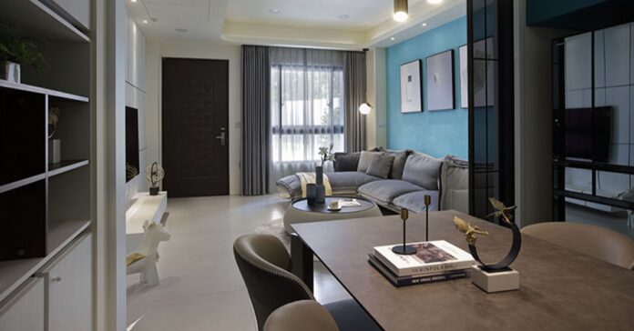 4.國美晴空實品屋《現代莫蘭迪 Morandi Blue》美國Muse Design Awards【金獎】、墨爾本 Melbourne Design Awards【優選獎】,以現代精品風格定調,透過圖騰與線條建構空間的立體感,並選用灰、黑、藍、棕色系,搭配出整體空間的流暢度。