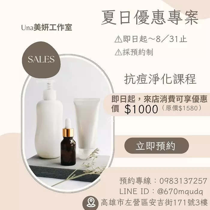 左營不推銷做臉『Una美妍工作室』,豐富經驗頂級美容師以專業手技、獨家按摩手法,依美眉個人的膚況、保養的需求、平日習慣,量身訂做!客製適合的美容美體方案,價格親民平實,左營不踩雷做臉『Una美妍工作室』讓肌膚輕鬆把保養品中的營養吃進去肌膚裡,讓美眉們擁有水噹噹的肌膚 !裡裡外外就是水嫩動人。