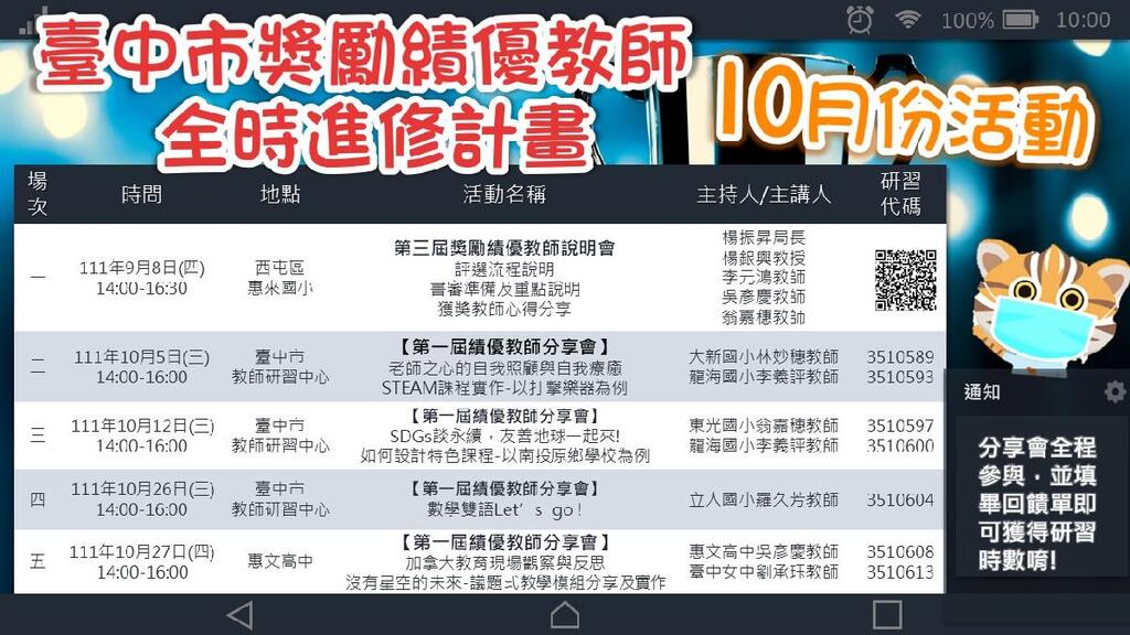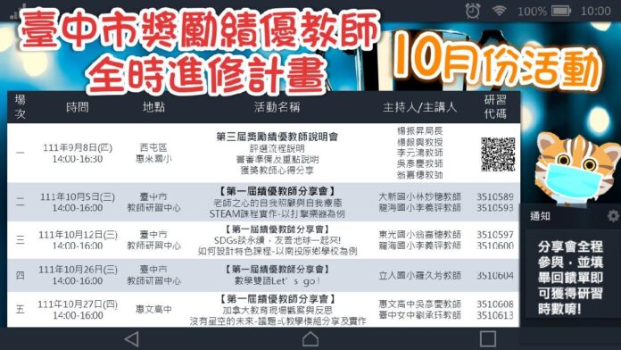 台中市長盧秀燕上任後全國首創「績優教師全時進修獎勵計畫」,每學年度評選6名高國中小績優教師,可至國內外進行一學期自主進修研究。第三屆績優教師報名自9月1日至10月24日,9月8日將於惠來國小舉行說明會,歡迎台中市教師踴躍參加。