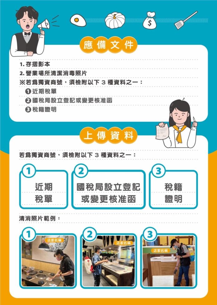 經發局表示,清消照片無須委由專業清潔公司,可請員工於營業場所內拍攝清潔消毒中的照片,如清洗店面設備、擦拭桌椅、酒精消毒桌椅,或其他可辨識正在清消中的照片;稅籍佐證資料方面,公司型態業者無須檢附,其餘業者則附上「近期稅單」、「國稅局設立或變更核准函」、「國稅局核發的相關稅籍證明」等三選一即可。