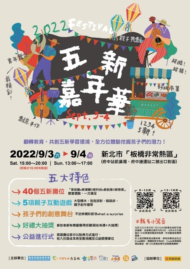 「五新嘉年華」來新北市辦活動囉!新北市政府青年局與星星國(社團法人中華FUN心關懷公益協會)共同主辦的嘉年華活動,將於本週末(9月3日與4日)於捷運府中站二號出口外熱鬧登場!活動現場有多樣體驗主題,包括親子共學、創意互動、科技實驗教育等,0到80歲的民眾皆可參與,歡迎大家共同體驗!