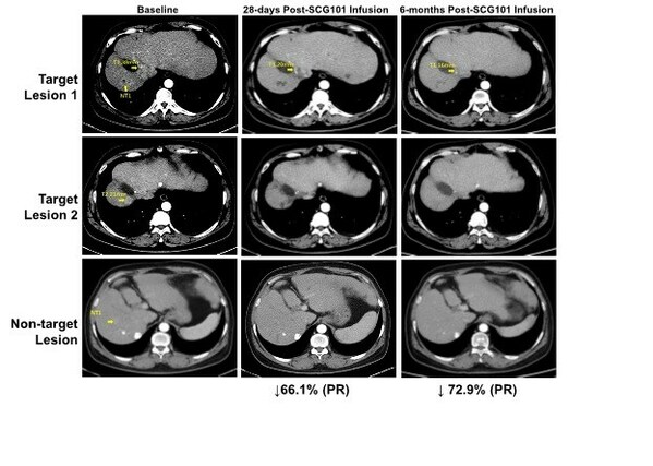臨床數據顯示,SCG101具有顯著的抗腫瘤和抗病毒活性,一名患有乙型肝炎病毒(HBV)相關肝細胞癌(HCC)患者接受單劑SCG101輸注後,第28天腫瘤靶病灶相比基線縮小66%,達到部分緩解(PR),並在第4個月進一步縮小74.5%;另一處病灶完全消失。試驗期間患者沒有接受任何其他抗腫瘤治療。數據截止時,腫瘤已保持超過6.9個月沒有進展,保持持續緩解狀態。