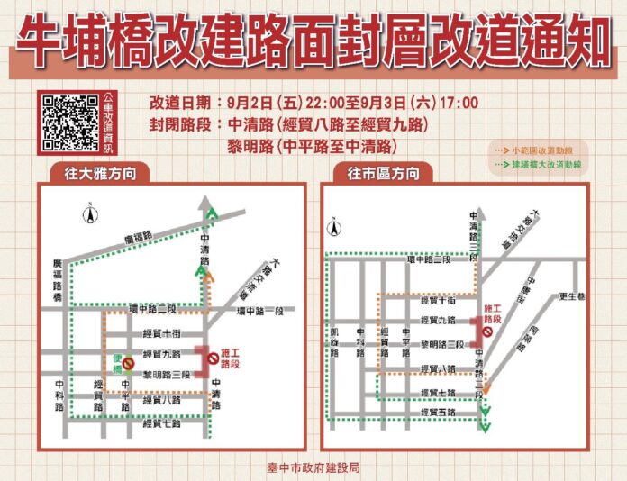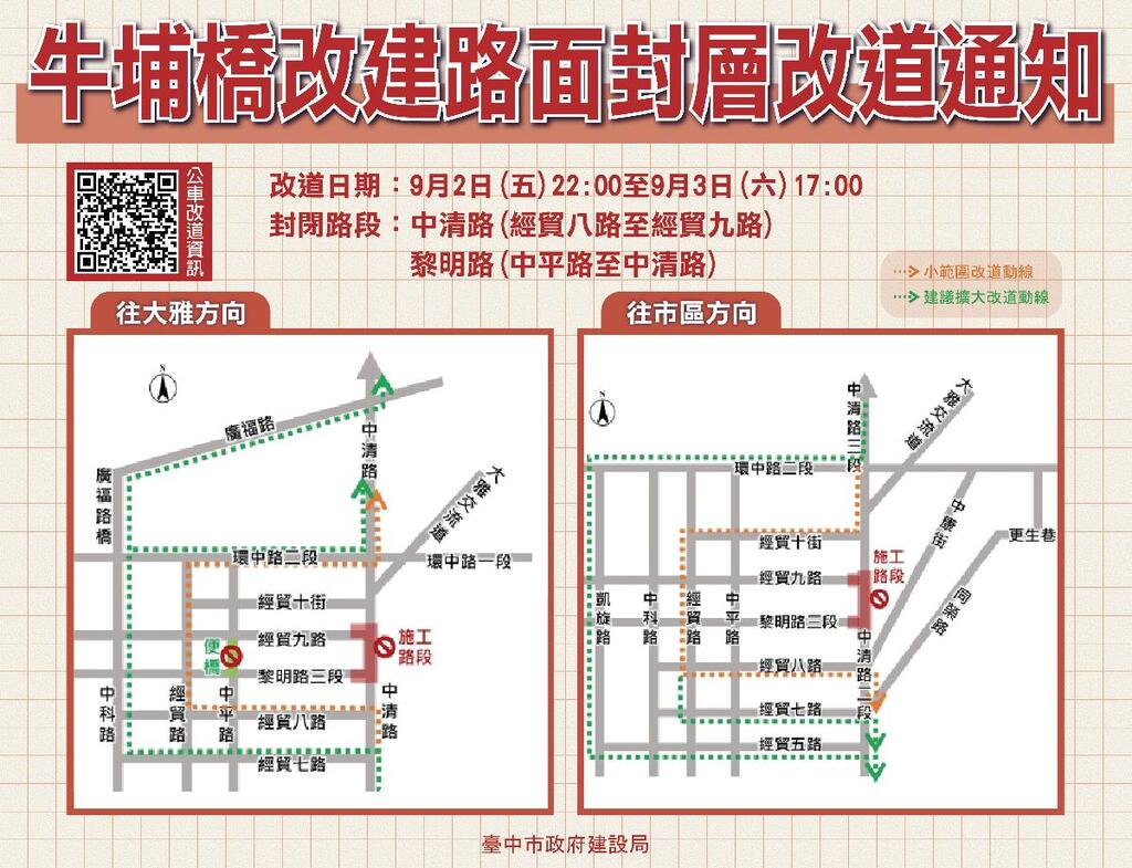台中市西屯區牛埔橋預計提前於9月中旬開放通車!牛埔橋改建工程主線橋面結構完成,將接續辦理路面封層,明(2)晚10時起至9月3日下午5時將封閉中清路(經貿八路至經貿九路)及黎明路(中平路至中清路),市府建設局提醒,請用路人提前改道行駛,並聽從交管人員引導,造成不便,請市民見諒。
