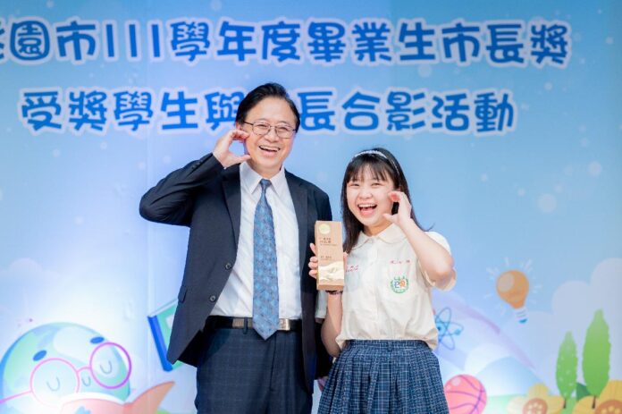 教育局長劉仲成表示,111學年度畢業班市長獎受獎學生,高中職共218人、國中共450人,其中有6位具特殊優良事蹟學生獲特別表揚,包含:北科附工李語晴、觀音高中張浤育、桃園特殊教育學教陳俊華、中興國中余宥芹、東興國中許筑媛、平鎮國中陳柔嘉。