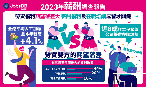 香港2023年6月8日 /美通社/ — JobsDBSEEK 旗下領先的香港網上求職招聘平台,最新公布《2023年薪酬調查報告》結果顯示,香港打工仔薪酬增幅連升三年!2023年平均人工加幅達4.1%,創四年內高峰,維持跑贏通脹的升幅。