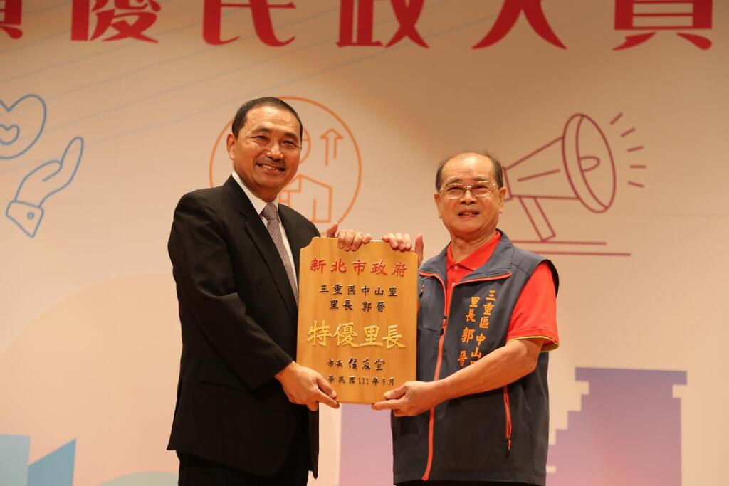 新北市政府今(1)日舉行111年特優里長及績優民政人員表揚大會,由市長侯友宜致贈獎牌予122位特優里長及51位績優民政人員,其中,最高齡者為79歲三重區中山里長郭晉,最年輕者則是31歲永和區民治里長陳以樂,以及服務年資最長的永和區光復里長林炳文都受邀前來。侯友宜感謝他們站在第一線,帶給市民優質全方位服務。