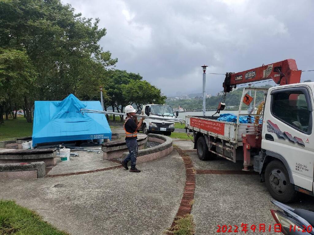 為因應軒嵐諾颱風外圍環流逐漸影響北部、東半部,依氣象局最新公布路徑預估,今晚(9/1)到明晨可能發布海上颱風警報,未來將一路朝北方向前進,考量已感受外圍環流帶來風勢強勁,新北市高灘處已針對河濱公園部分,於9/1預防性完成帳篷設施撤離,其中包含帳棚262頂、薄膜5處、傘8支、認養單位自行撤離帳棚22頂,共計297頂;另新店區青潭浮筒橋自行車道,上方固定座含圍網已吊至岸上暫時安置,明(9/2)浮筒橋自行車道將全數吊離上岸並運送至指定地點放置。以維護河道暢通並保障遊憩民眾之安全。