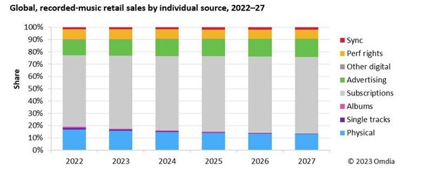 倫敦2023年6月20日 /美通社/ — 據 Omdia 發表的最新數據,全球唱片音樂零售銷售價值今年將創下新記錄,從 2022 年的 381 億美元上升至 410 億美元,增長了 7.8%。該研究服務預計年度增長將持續到 2027 年,屆時零售銷售額將達到 498 億美元。
