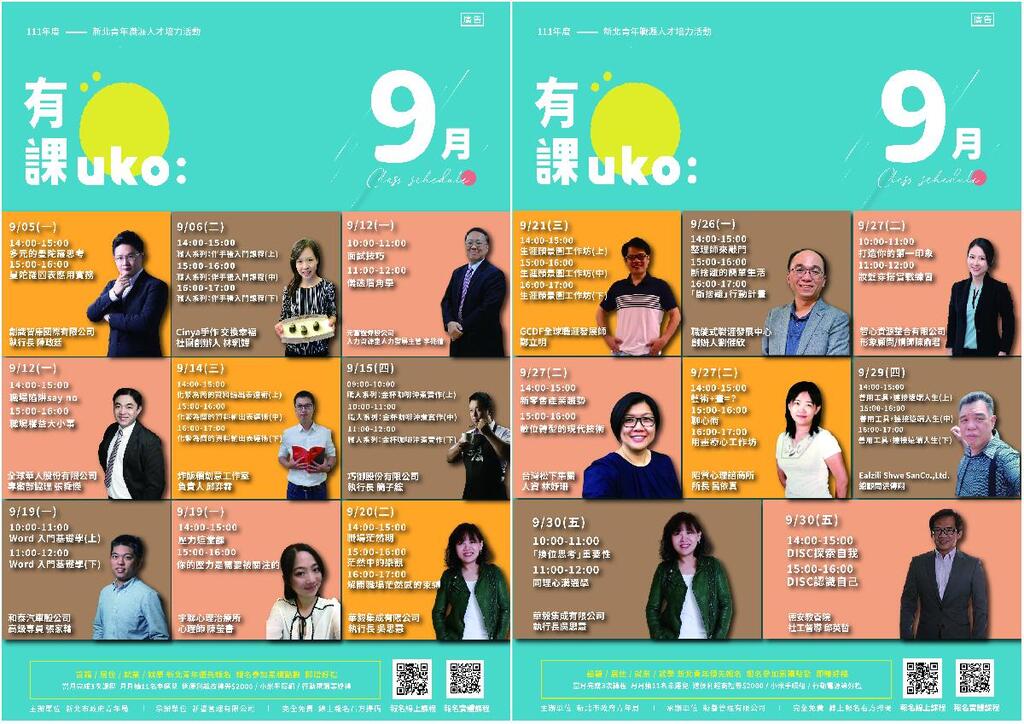 新北青年局即將於9月17日邀請獲得二次金鐘節目主持人獎殊榮的廖科溢在新店辦理大型講座,廖科溢將分享自身冒險故事,引導青年朋友跨出舒適圈,線上報名已額滿,9月仍有多場免費職涯課程,帶領青年朋友為進入職場做好萬全準備!