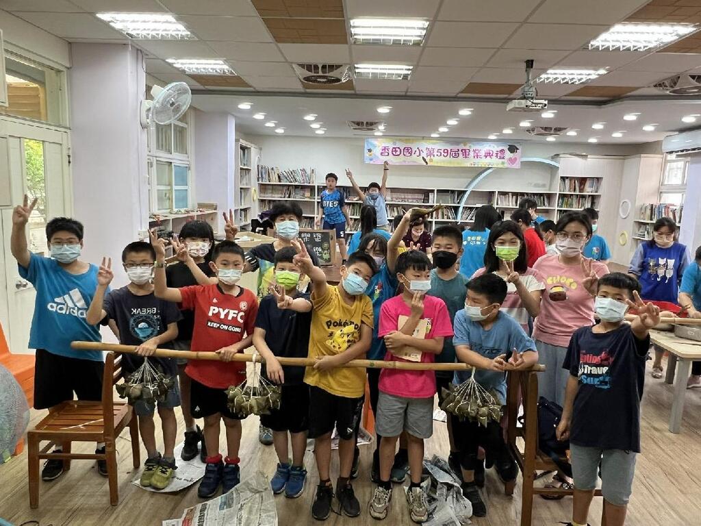 早在端午節前,這群小朋友就開始跟著家長、老師與志工忙進忙出,刷粽葉、洗竹竿、布置場地等,待一切就緒,就是學習如何將粽葉摺出漂亮的形狀、填料,與綁出一只只結實飽滿的粽子,香田國小賴宜鈴主任表示,學校辦理這次活動,目的是為了讓小朋友用自己的能力對社會盡一份付出,為弱勢的人做一些事,同時在場不少人其實也不會包粽子,透過這個機會多跟社區長輩互動;現場每個參與的小朋友都認真專注地接受指導,在彼此同心協力下,共綁出了200多顆粽子,成果滿滿,一名六年級學生分享能在畢業前夕幫助他人,別具意義,也有小朋友提到能跟阿嬤學綁粽子很有成就,不管大人或小孩都很開心。