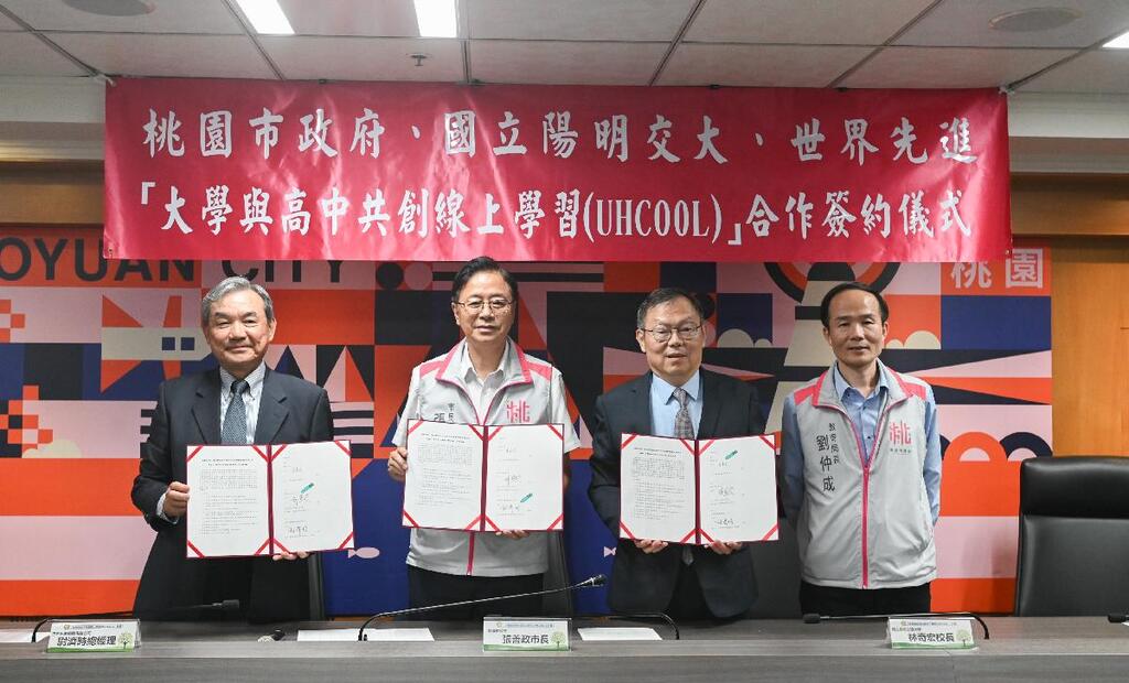 桃園市長張善政今(26)日下午於市府,出席「大學與高中共創線上學習(UHCOOL)」合作簽約儀式。張市長表示,今日由市府代表桃園市各高中與國立陽明交通大學、世界先進積體電路公司簽署「大學與高中共創線上學習(University/High-school Collaboration On Online-learning, UHCOOL)」三方合作備忘錄,將製作推廣「半導體原理與製造概論」數位課程,提供高中生提早接觸半導體領域專業知識與實務的機會,為桃園的年輕人開闢深具潛力的發展方向,並讓桃園的學校創造教學特色,也為半導體業界培養優秀人才,進而確保台灣「護國神山」產業優勢。