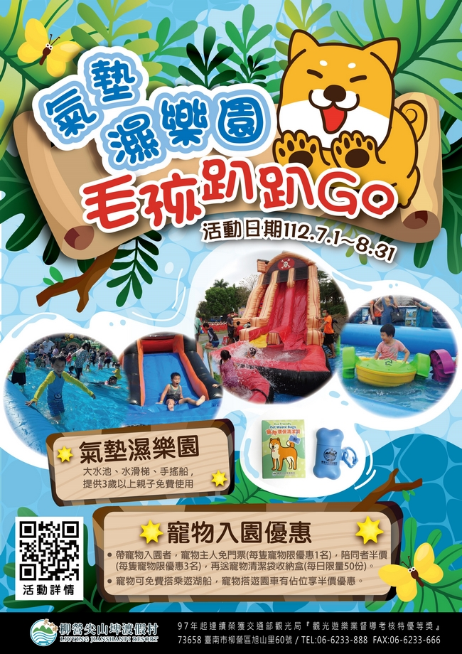 今年夏天臺南又多了一個消暑的好去處!為讓民眾在炎炎夏日享受戲水的清涼與歡樂,台糖柳營尖山埤渡假村引進全新「氣墊濕樂園」親水氣墊設施,暑假期間開放3至12歲兒童免費玩到飽(自112/7/1至8/31止),並結合「蝴蝶王水陸大冒險」、「毛孩綠市集」及「寵物入園優惠」等活動,住宿房客還能免費參加「生態夜觀」專業導覽,保證讓大小朋友擁有沁涼又充實的暑假假期。