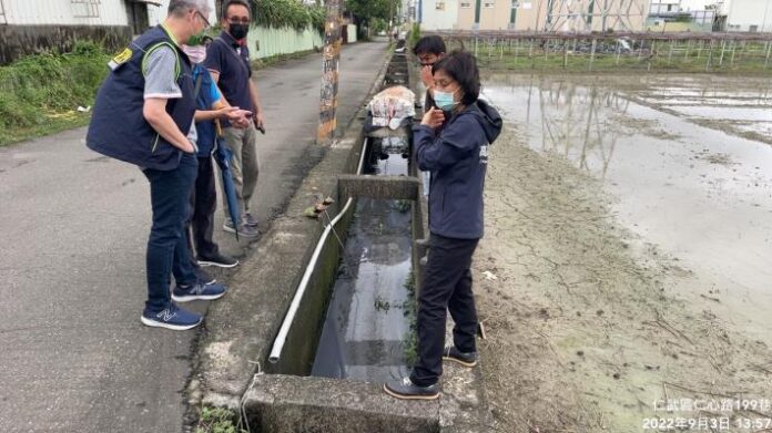環保局表示,今(3)日上午接獲民眾檢舉仁武區仁心路199巷排溝出現乳白色混濁廢水污染情事,經沿線溯源巡查於新O公司門口旁排溝發現一股廢水流出,查係業者趁下雨天將廢水以未經許可的專管繞流排放所致,導致排溝沉積大量灰色遭污染之底泥。
