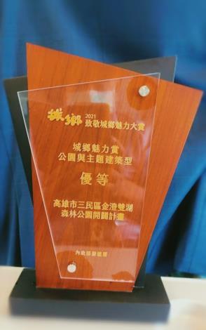 由內政部營建署主辦的「2021致敬城鄉魅力大賞」,是為展現各縣市政府在前瞻基礎建設「城鎮之心工程計畫」的執行成果,並與民眾分享城鄉共生、魅力共創、韌性永續及優良景觀的城鄉新典範。獲獎名單於8月初公布,高市府工務局養護工程處闢建的金澄雙湖森林公園榮獲「城鄉魅力賞」肯定,並於今(3)日在華山文創園區舉行頒獎典禮,顯示市府努力為市民創造舒適優美的水岸、公園綠地,共同形塑城區新空間並串聯鄉鎮特色,打造宜居的美好城市!