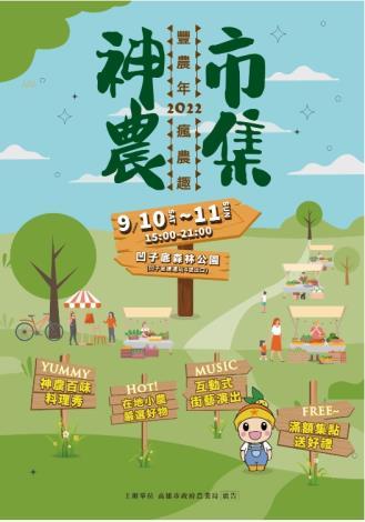 中秋節闔家團圓「呷魚呷肉嘛愛青菜水果來嘎」,產地直送的神農市集就是採買安心農產的第一選擇!高雄市政府農業局主辦的神農市集於八月初盛大開幕,佳評如潮、買氣創新高,為將活動熱度延續,配合中秋連假,本週末9月10日、11日即將於凹仔底公園活力登場,集結全高雄區域在地化深耕優質小農與中南部地區優選農園、近百位攤商,還有免費農特產品試吃展售活動、高雄六龜聚寶來主廚料理秀、多組精彩街藝演出,創造規模最大、最高品質、產地新鮮直送兼具寓教於樂的多元化農產品展售活動。