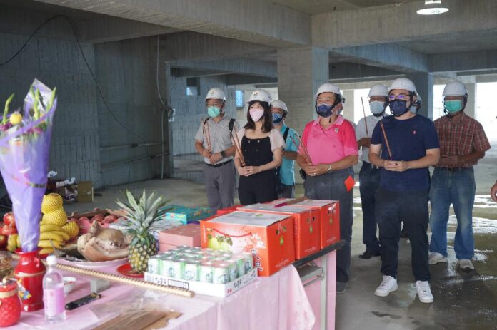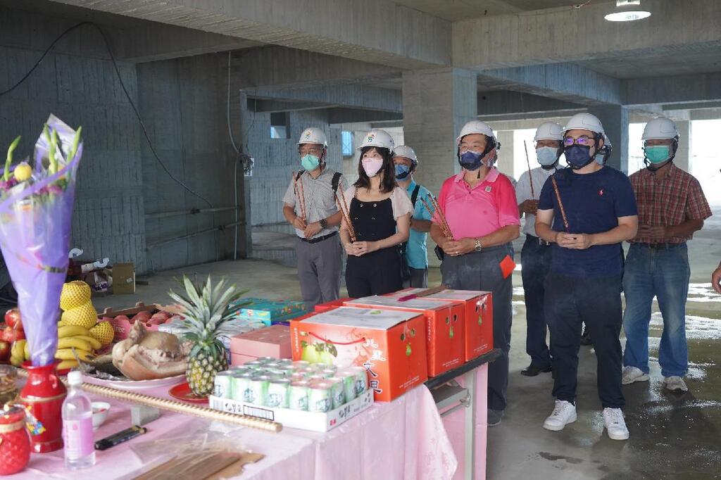 為提升八里地區市場服務,新北市政府引進民間資源興建龍形市場,去(110)年12月由市長侯友宜親臨現場為新建工程開工祝禱,僅相隔9個月,今(5)日由市場處長盛筱蓉與民間開發單位全翰龍形廣場股份有限公司董事長韓保全一同為工程上梁祈福,祈求根基永固、順利完工。