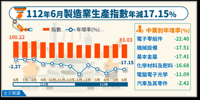 1.與上月比較:112年6月工業生產指數83.86,較上月減少1.40%,其中製造業減少1.46%;經季節調整後,工業生產減少0.68%,製造業減少1.23%。