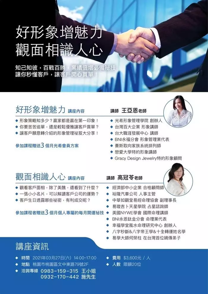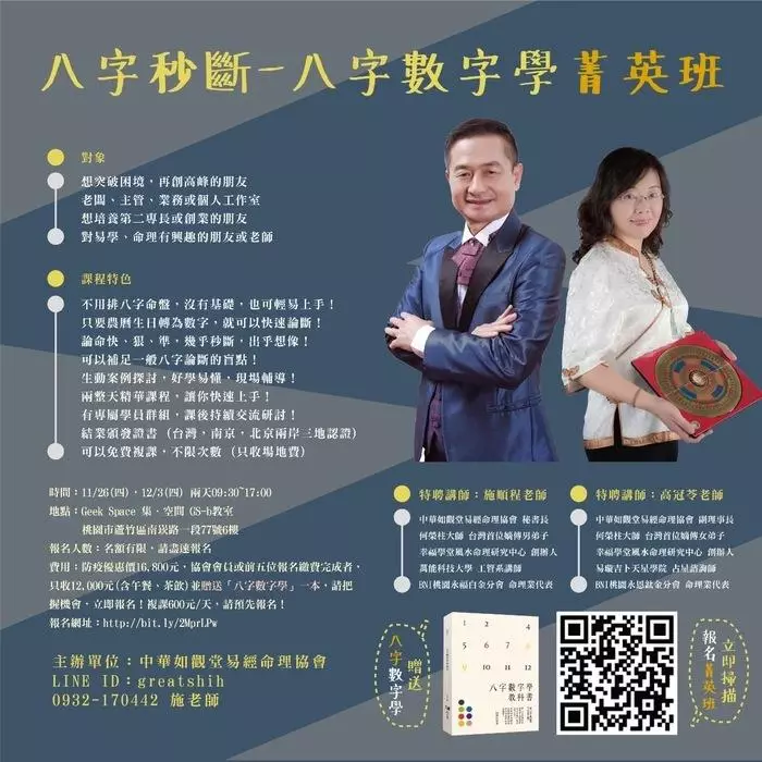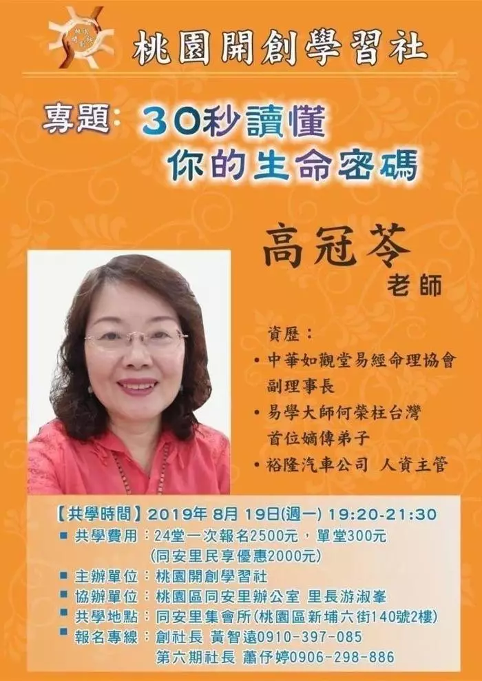 除了命理諮詢外,桃園八字教學課程『幸福學堂風水命理』,也提供八字秒斷、八字學、姓名學、風水學等等命理課程教學,以生動案例探討,易學!易懂!迅速成為論命「快、狠、準」命理老師,適合對於易學、命理有興趣的朋友,或想要發展第二專長的朋友,從入門到專業,需要一顆學習的心!還有想要讓自己與他人幸福的動力!