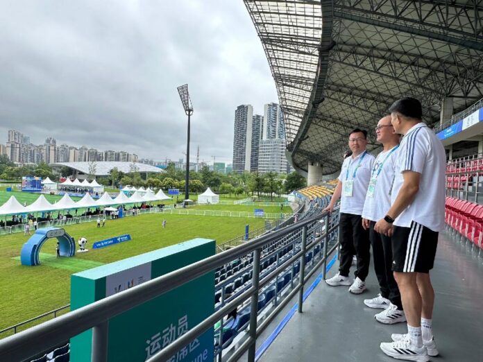 成都世界大學運動會將於明(28)日開幕,射箭及水球今(27)日率先登場,我代表團首場賽事今日上午在成都現代五項賽事中心馬術體育場開戰,射箭反曲弓將舉行資格排位賽、團體賽16強至4強賽事,複合弓將舉行資格排位賽,中華隊眾將已準備出擊,力拚獎牌。教育部林騰蛟次長丶體育署鄭世忠署長連袂親至賽場觀賽,為選手加油。