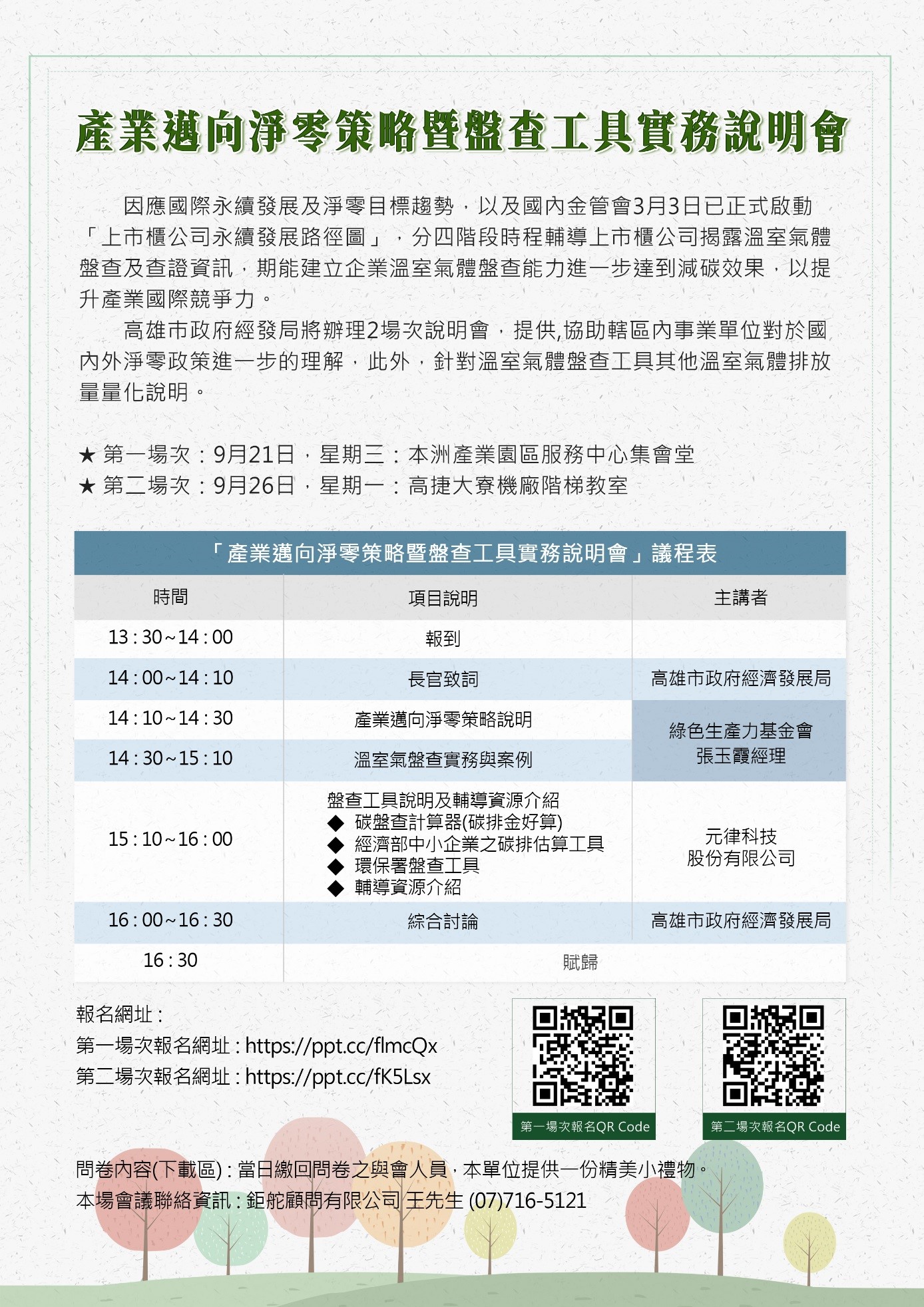 高雄市政府積極推動淨零減碳,為協助在地企業盤查製程設備碳排放情形,經發局今(7)表示已規劃9月21日及26日於本洲產業園區服務中心、高雄捷運大寮機廠舉辦兩場「產業邁向淨零策略暨盤查工具實務」說明會,邀請業界專家解說淨零排放執行內容,並實際演練碳盤查工具、介紹資源,呼籲企業把握機會報名參與。
